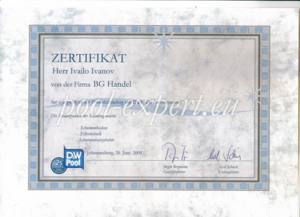 Сертификати за проведено обучение в Германия с акцент върху монтаж на сглобяеми басейни, филтърни системи и допълнително оборудване за басейни.